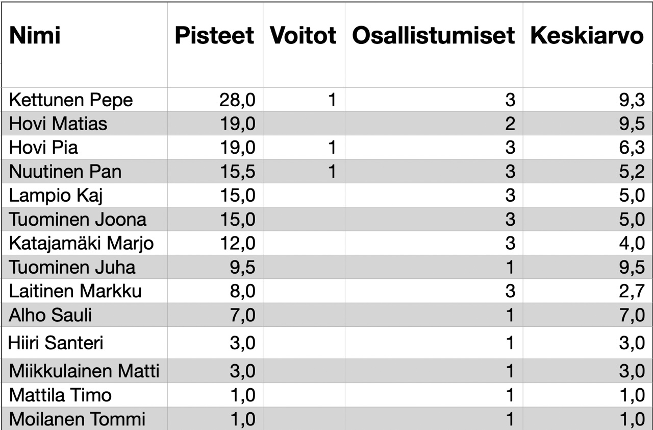 - Lisäksi yllätyspalkinto 3.- ja 4.:ksi tulleille (mikäli yli 16 pelaajaa niin 4.- ja 5.:ksi tulleille).