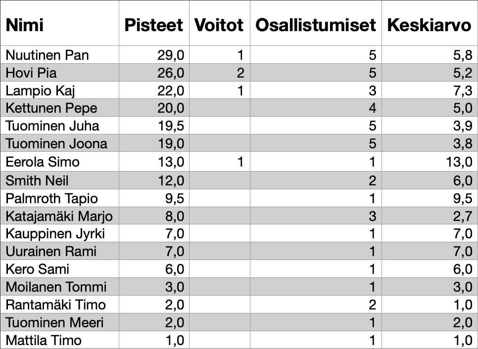 - Lisäksi yllätyspalkinto 3.- ja 4.:ksi tulleille (mikäli yli 16 pelaajaa niin 4.- ja 5.:ksi tulleille).